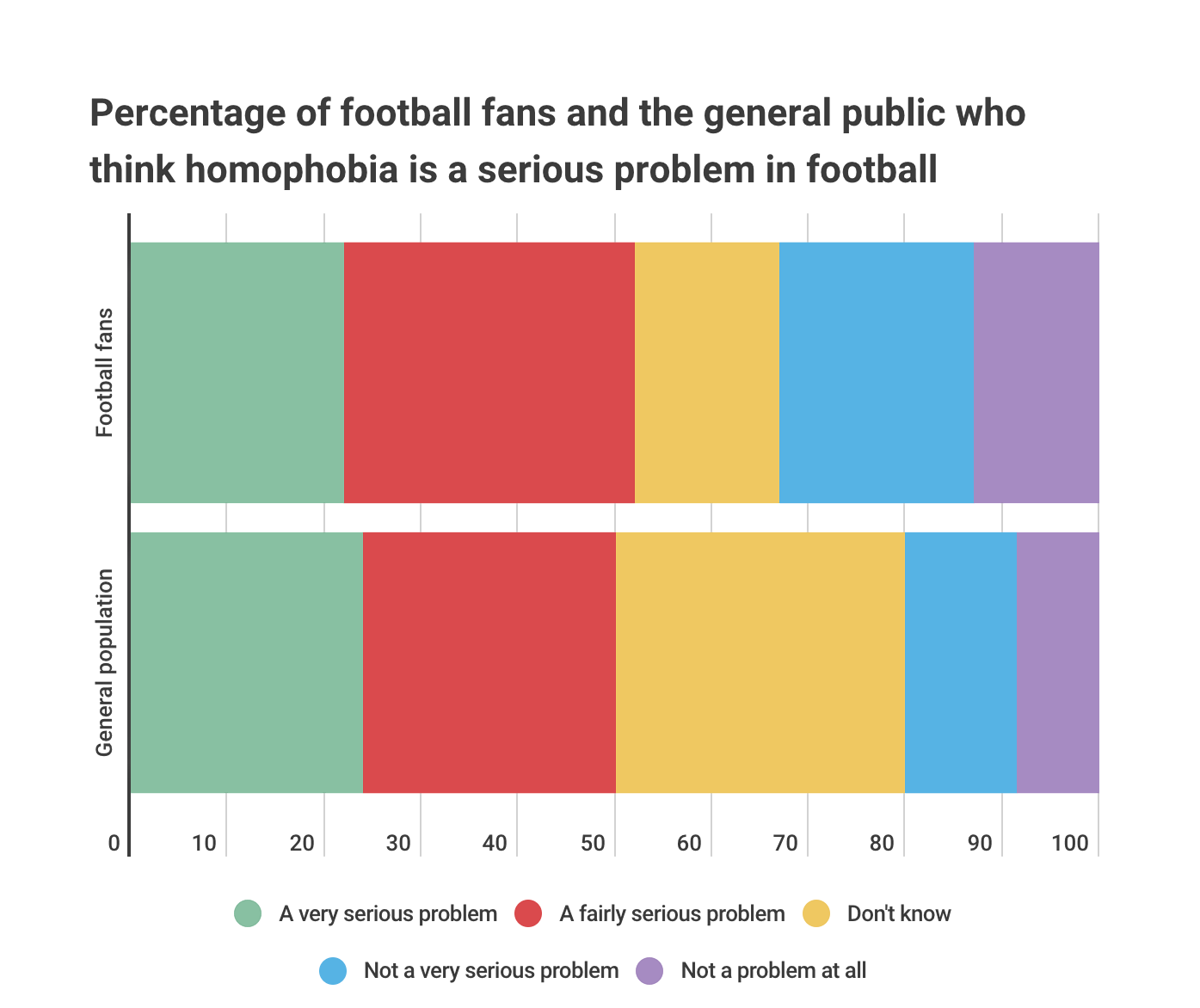 A graph showing what percentage of football fans and the general public think that homophobia is a serious issue in football.